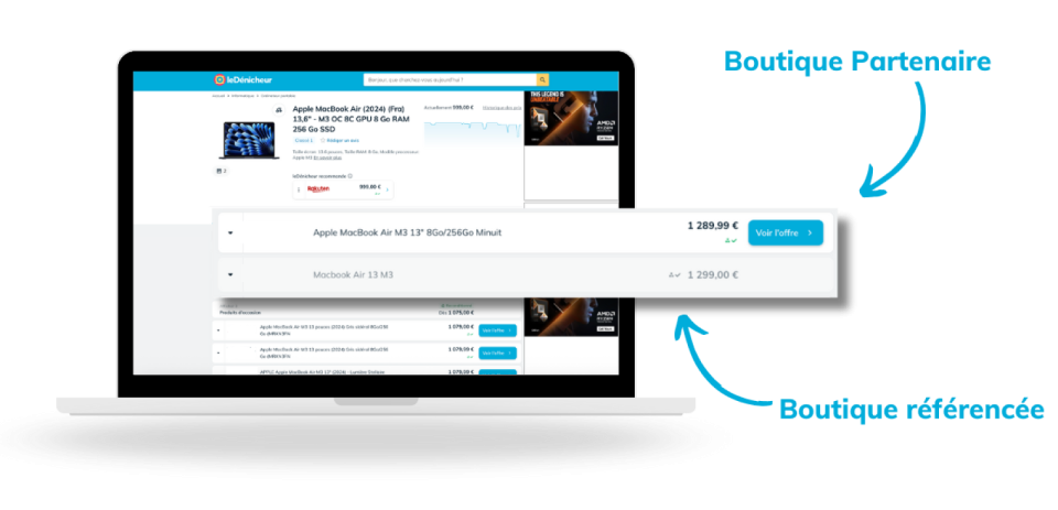 En profilant votre boutique sur leDénicheur, vous générez un trafic qualifié et prêt à acheter directement sur votre site. Vos offres apparaissent dans nos listes avec un bouton clair "voir l’offre”, simplifiant ainsi le parcours d’achat pour les consommateurs.